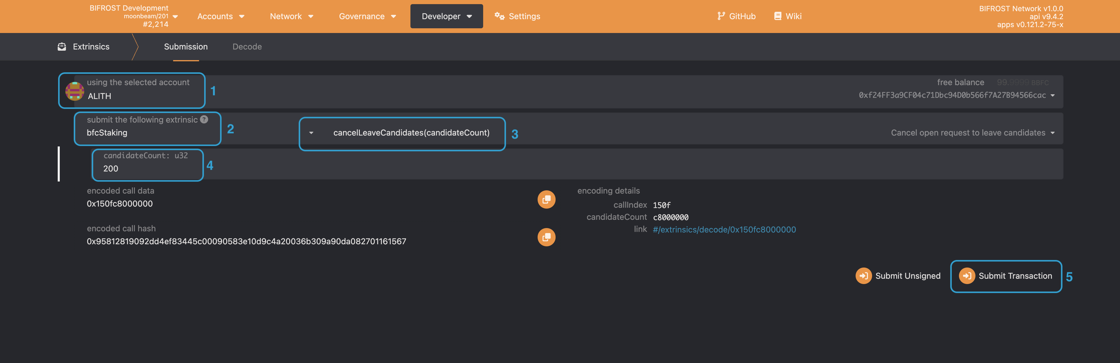 The entire process of exit consists of two steps, as with partial withdrawal. You must first perform the "Schedule Leave" process with the controller account. At this time, even if the request is successfully processed, exit cannot be immediately executed. You must wait for a certain number of rounds. ("Leave candidates delay") If you have finished waiting, you must finally perform the "Execute Leave" process with your stash account to complete the actual exit.