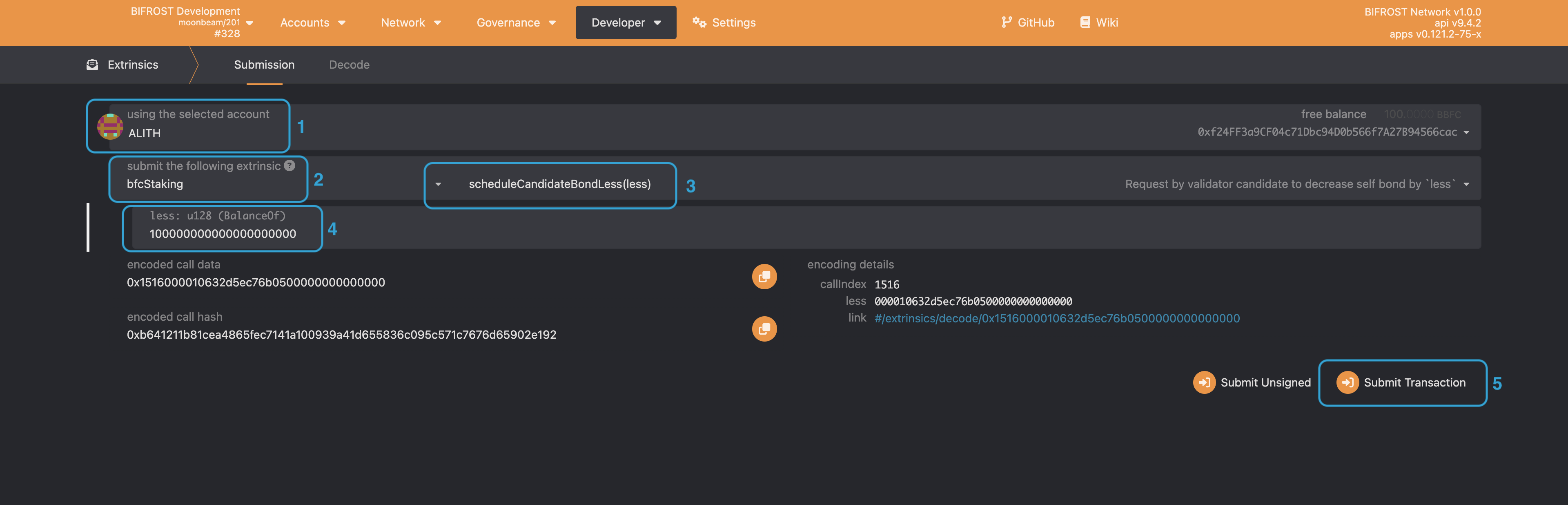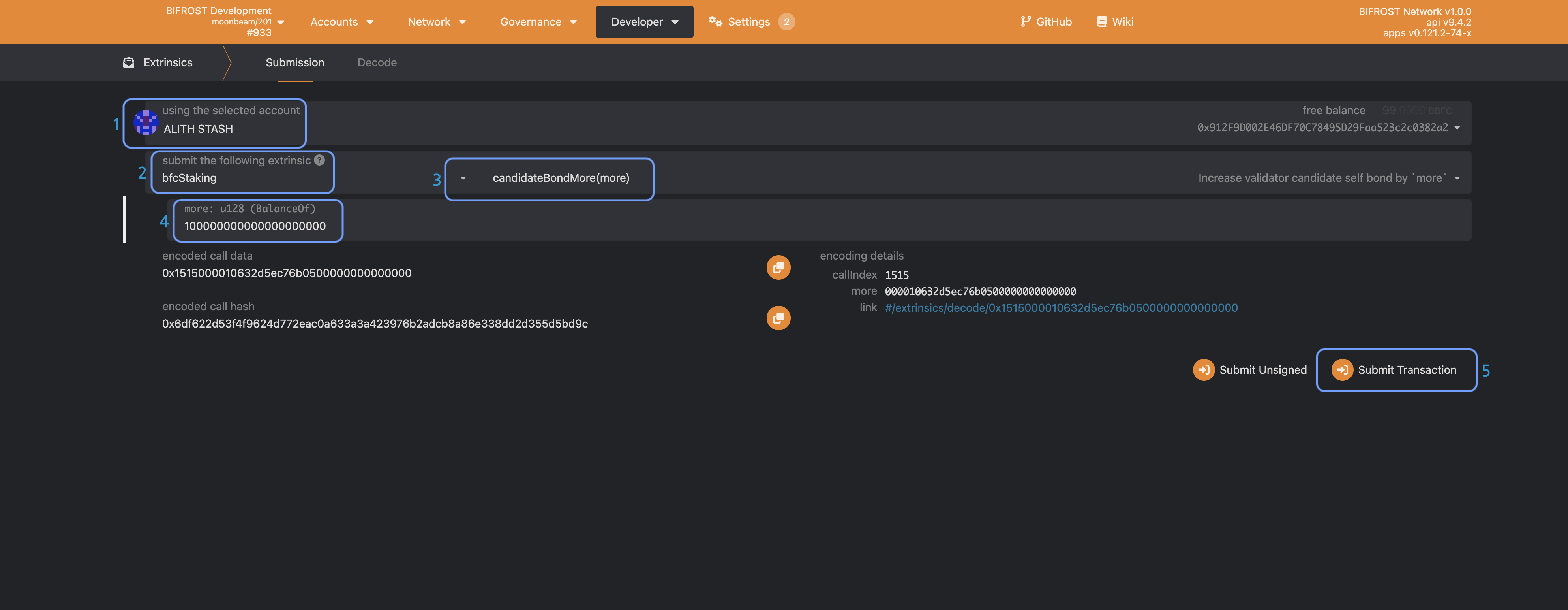 If an additional deposit of self-bonds is required, enter the BFC amount in wei units in the