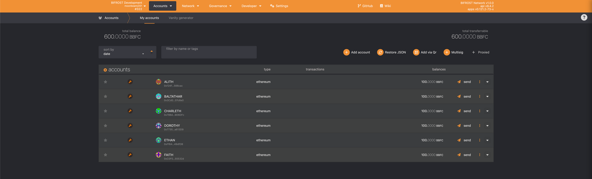 On the next page, you can create a backup file for the account you wish to register. The backup file is in JSON format, and with this, you can restore your account if necessary by clicking on the "Restore JSON" button located in the center of the "Accounts" page. Clicking on the "Next" button closes the window and the backup file will be downloaded. Once all processes have been completed, you will be able to check that the registered account has been added to the "accounts" list.