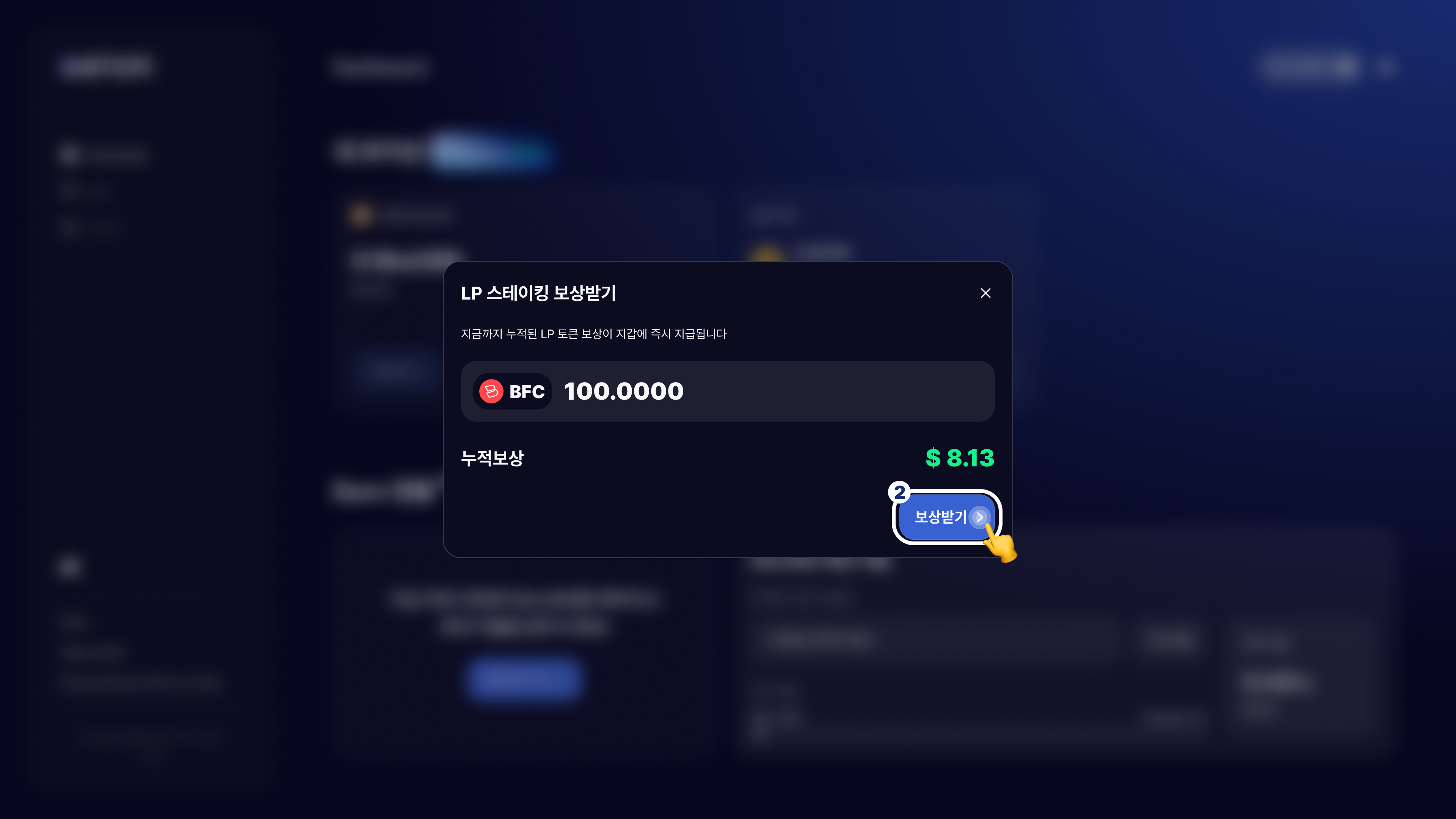 1. Dashboard 화면 하단으로 이동해, LP 스테이킹 내역의 <mark style="color:red;">`보상받기`</mark> 버튼을 클릭해 주세요.