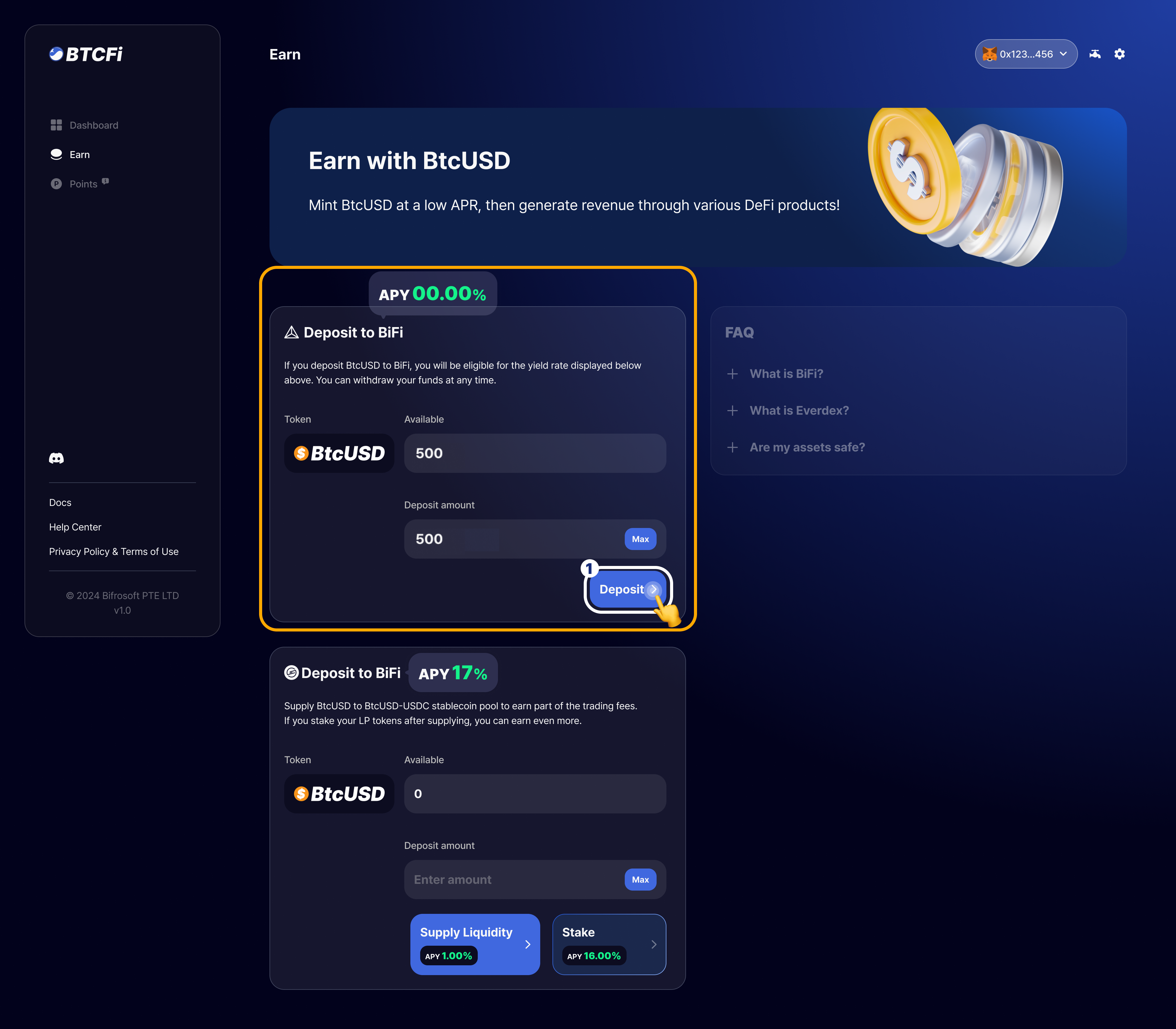 Depositing BtcUSD (BiFi)