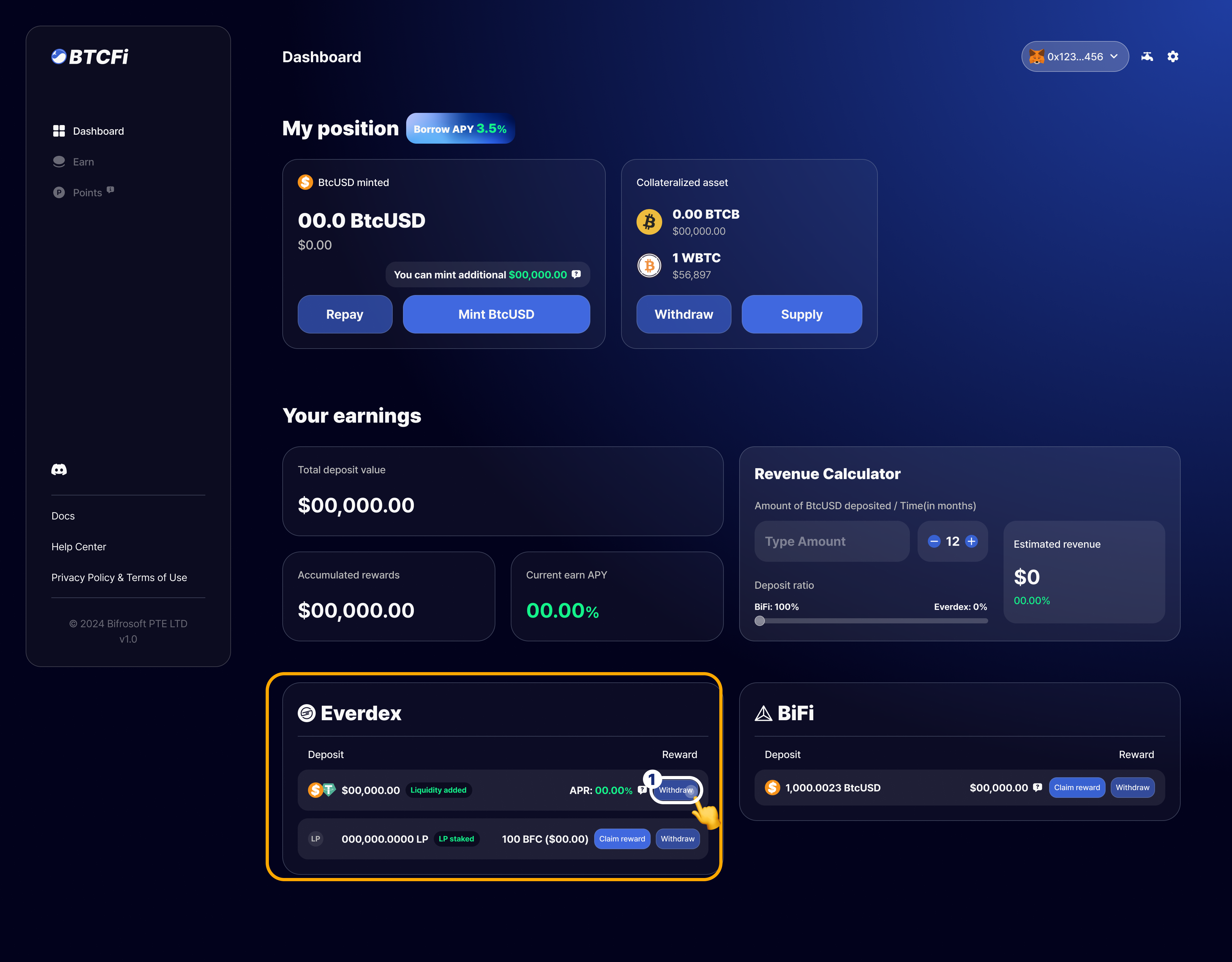 These are the steps that you can take to withdraw your liquidity from Everdex BtcUSD-USDC pool. You can use this liquidity to lower the LTV on your loan by paying back, or to retrieve your collateralized BTC.&#x20;