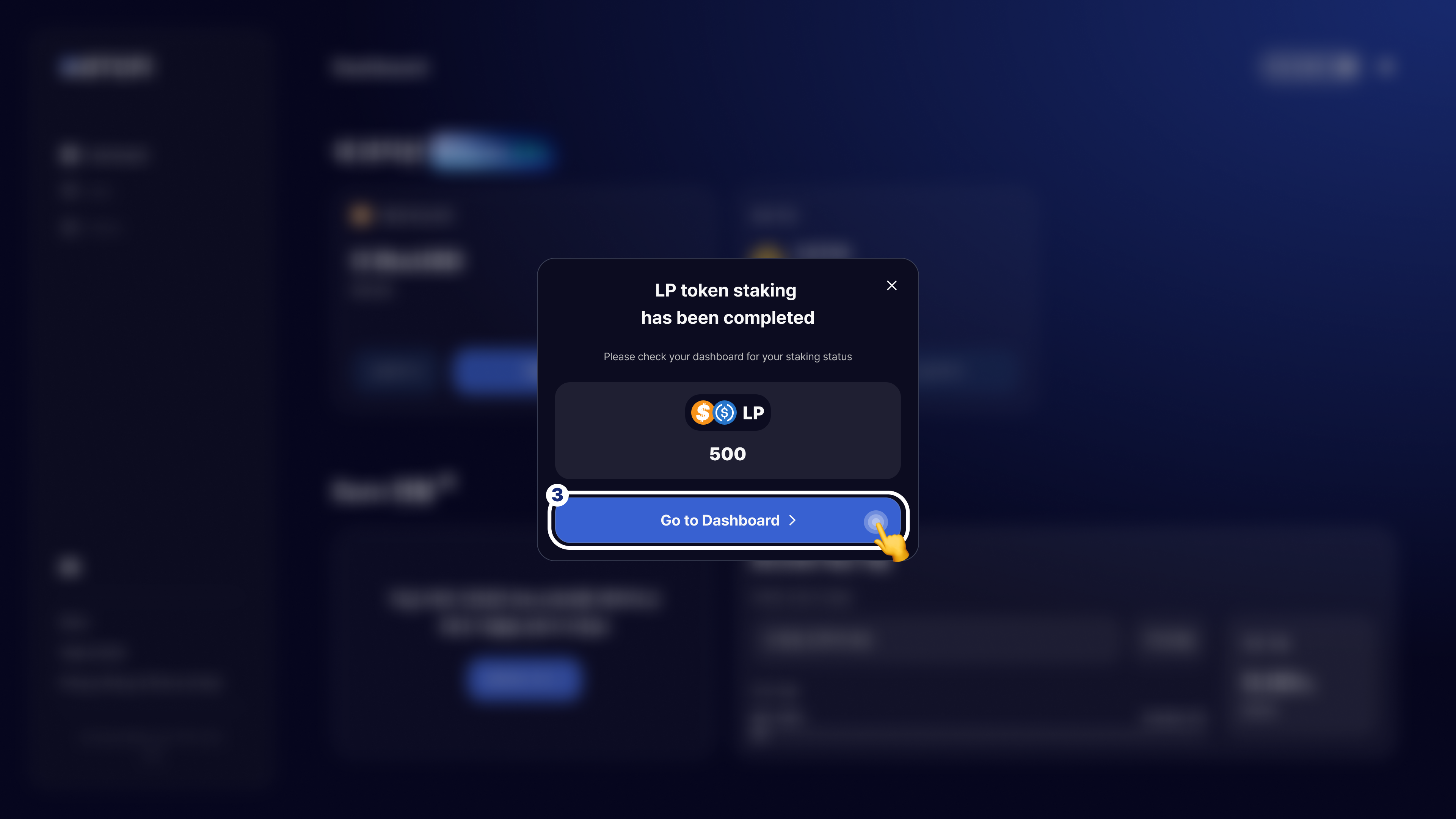 3. You have successfully staked your LP tokens. You can click on <mark style="color:red;">`Go to Dashboard`</mark> button to find your reward status.&#x20;
