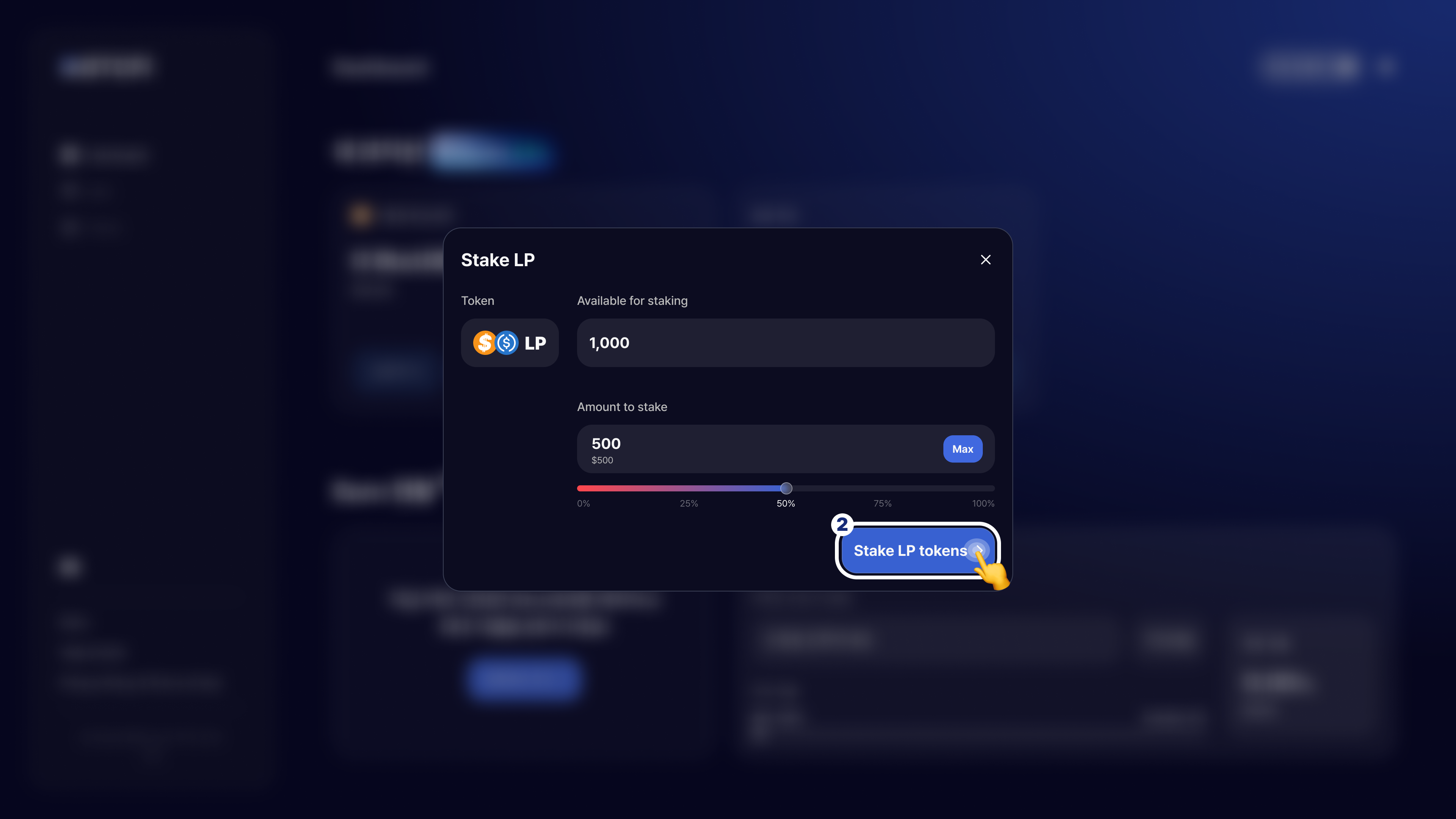 1. Click on <mark style="color:red;">`Stake`</mark> button to enter the amount of LP tokens to stake. \