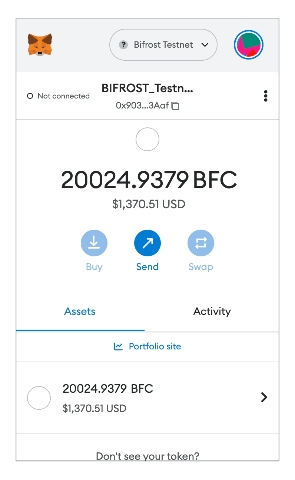 위 단계를 완료하면 지갑에서 BFC 토큰을 확인할 수 있습니다. 문제가 발생하면 디스코드(Discord)를 통해 문의해 주세요.