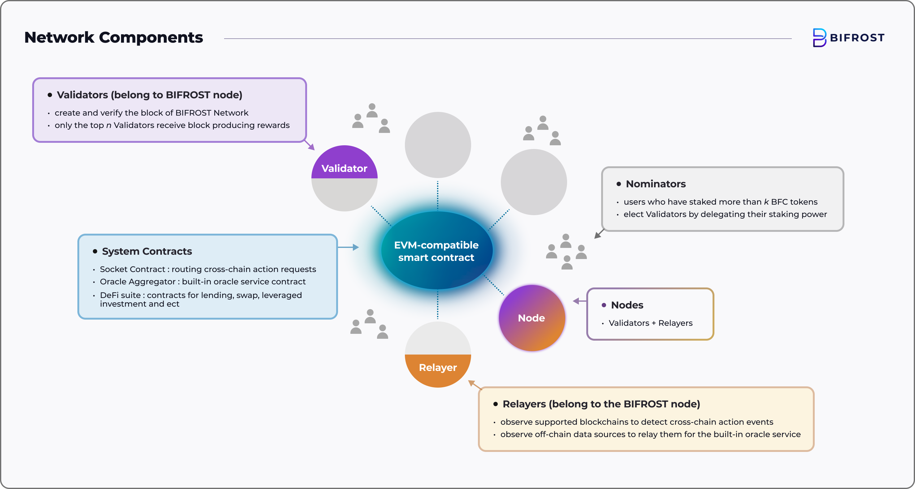 바이프로스트 네트워크의 풀노드 (Fullnode)는 노드와 릴레이어로 구성됩니다. 노드는 Substrate 프레임워크와 바이프로스트의 프리컴파일 (Precompiles) 컨트랙트들을 내장하고 있으며, 블록 생성 및 최종화 (Finalization)를 담당합니다. 릴레이어는 여러 블록체인을 모니터링하고, 블록체인 간 합의를 통해 크로스체인 작업을 안전하게 실행합니다.