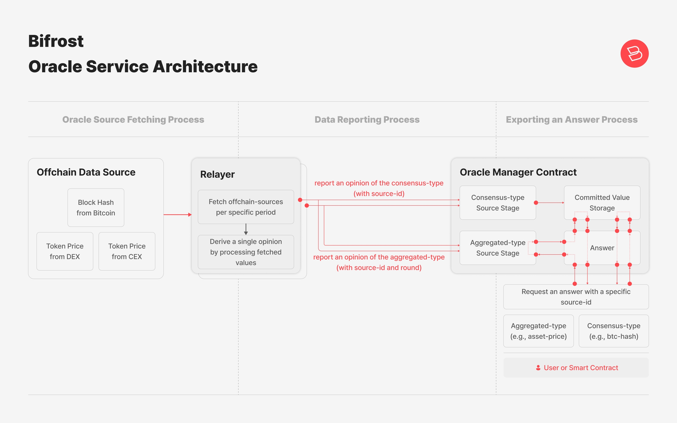 바이프로스트 네트워크의 오라클 서비스는 두 가지 유형의 데이터를 지원합니다. 하나는 데이터 소스 간 불변성이 요구되는 데이터로, 최신 비트코인 블록의 블록 해시 등이 여기에 해당합니다. 다른 하나는 정규화 및 집계가 필요한 데이터로, 토큰 가격 정보 등이 있습니다.