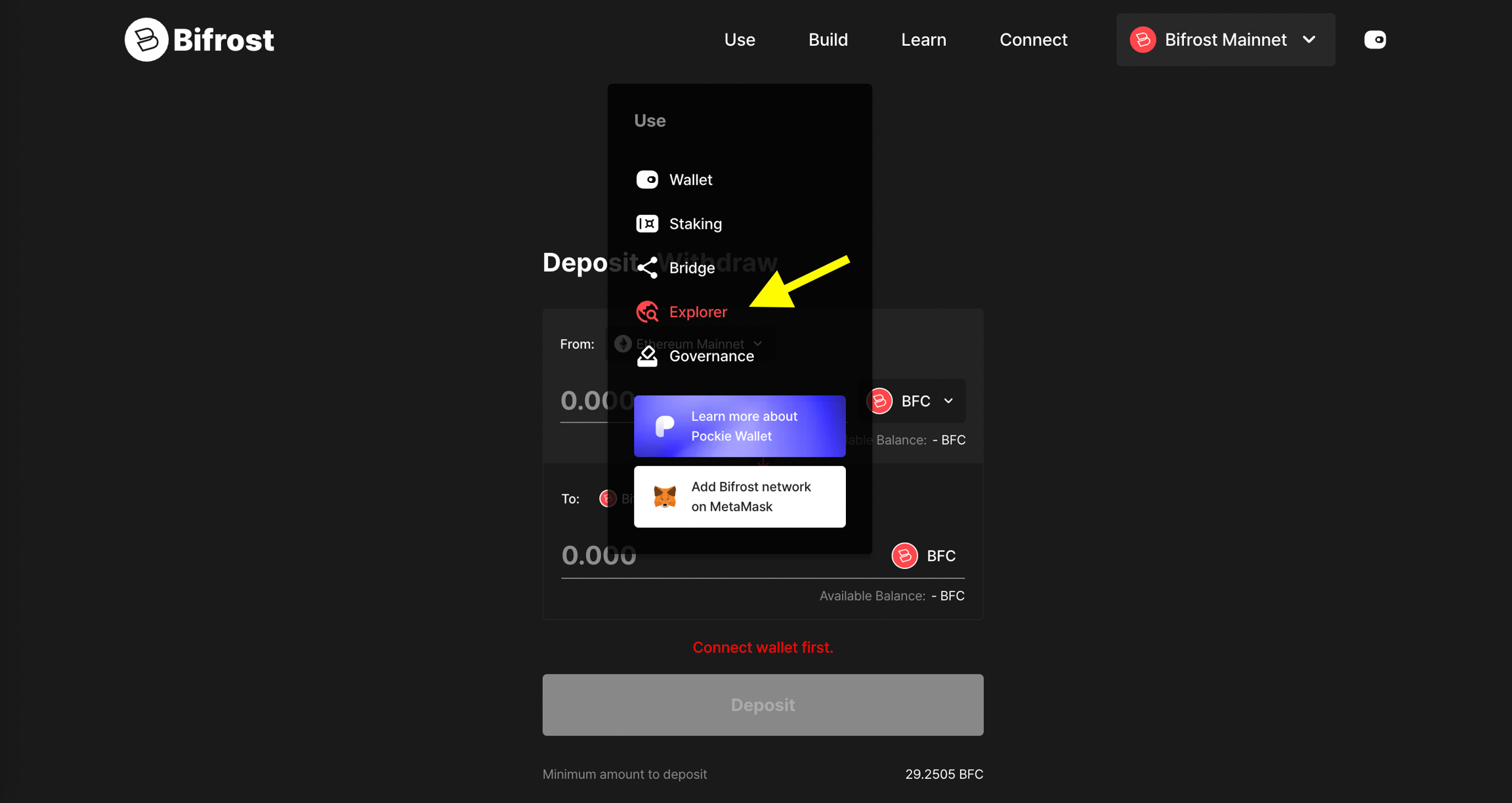 브릿지를 실행한 페이지 상단의 “Use” 탭에서“Explorer”를 클릭하여 블록 탐색기에서 트랜잭션 내역을 확인할 수 있습니다.