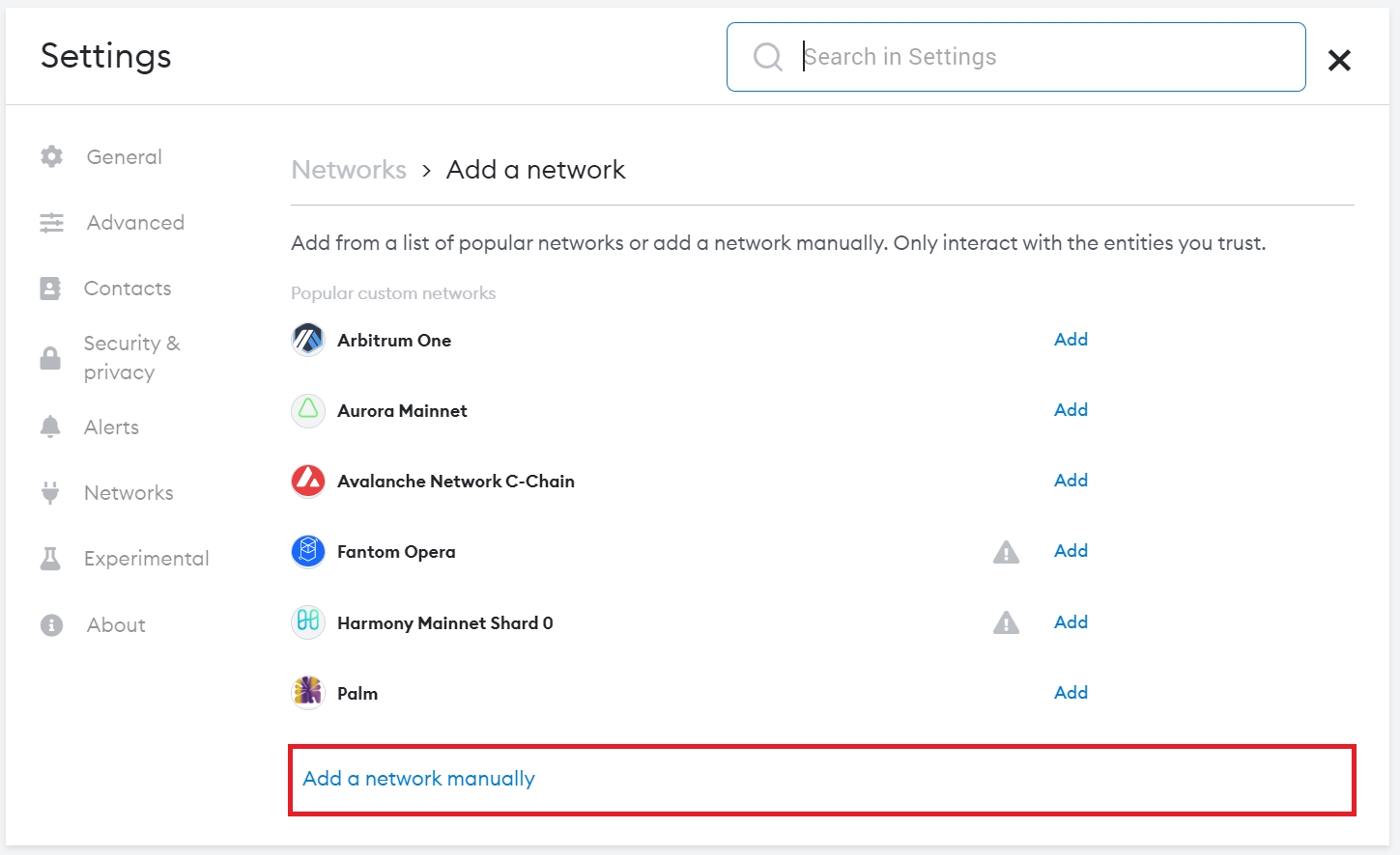 지갑에서 바이프로스트 네트워크가 보이지 않는다면 다음 단계를 따라 설정합니다: 설정 (Settings) → 네트워크 (Networks) → "바이프로스트 네트워크" 검색 후 선택하여 연결합니다.