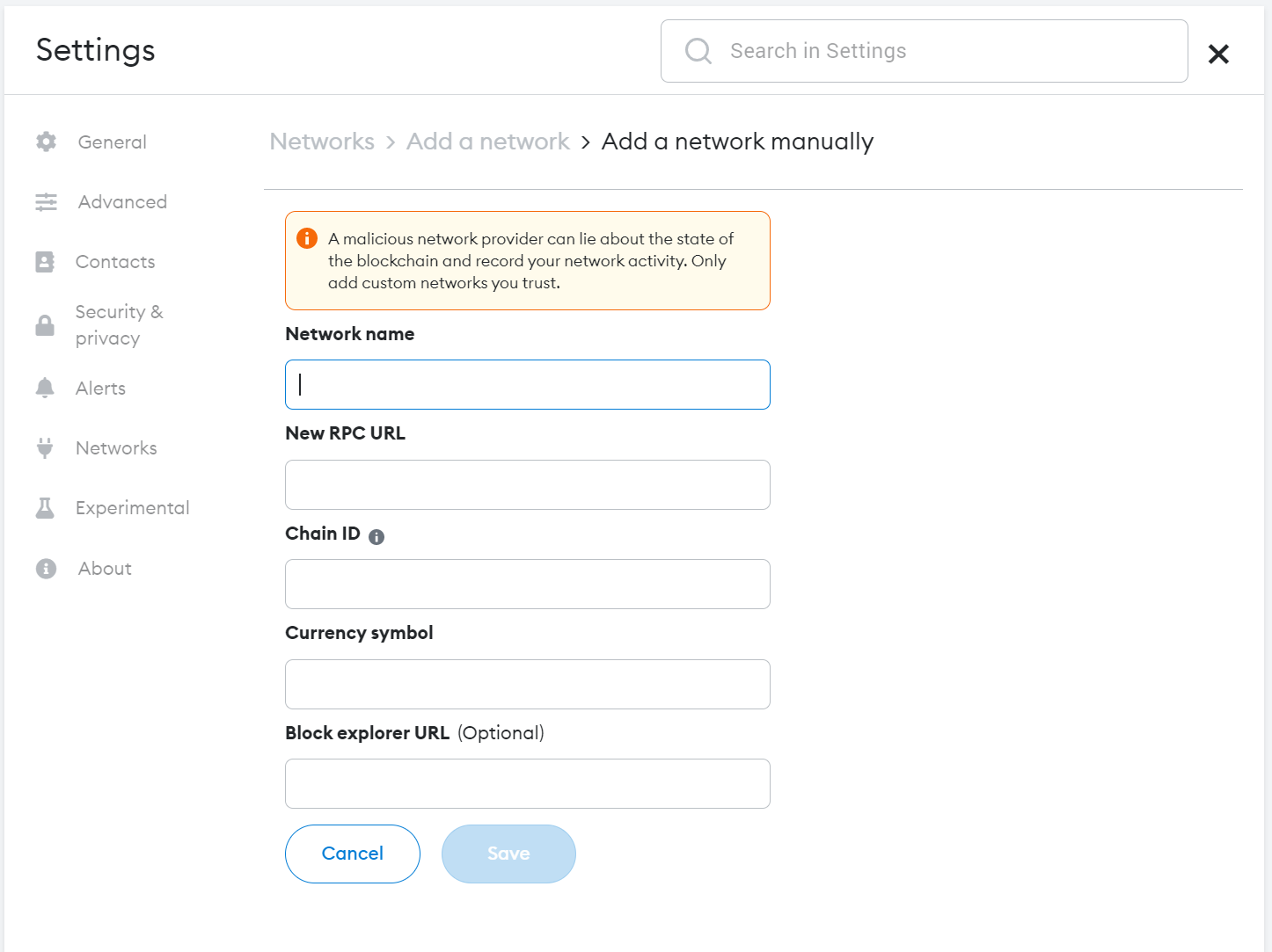 만약 검색이 되지 않는다면, 다음 정보를 “네트워크 추가 (Add network)” 페이지에 입력한 후 저장합니다: