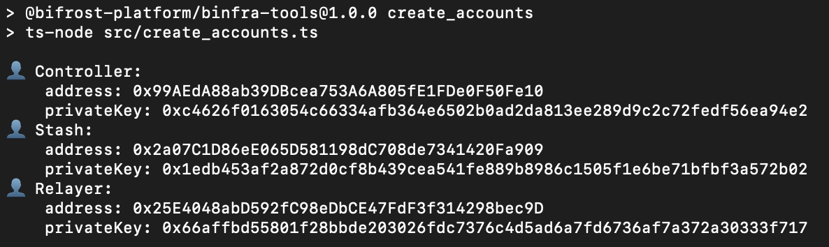 명령어를 실행하면 사용 가능한 새 검증자 계정이 다음과 같이 출력됩니다. 다음 프로세스를 진행하려면 각 계정에 요구 사항을 충족하는 충분한 BFC를 전송해야 합니다.