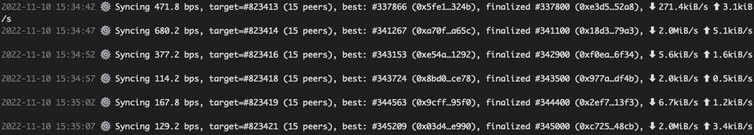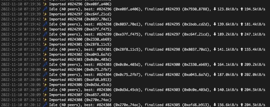 노드 실행을 시작하면 아래와 같이 제네시스 블록부터 체인 데이터를 동기화하기 시작합니다. (경우에 따라 에러 로그가 표시될 수 있지만, 현재로서는 무시해도 무관합니다.)