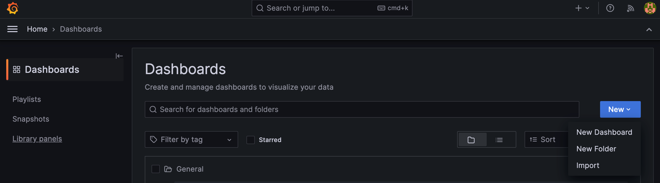 다음으로, 대시보드를 가져와야 합니다. "Dashboards" 탭에 접속한 후, 아래와 같이 "New"를 클릭하여 대시보드를 불러옵니다.