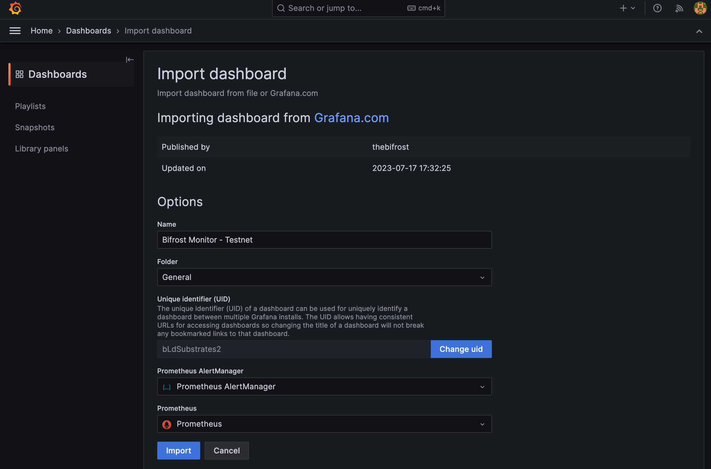 정상적으로 불러와졌다면, 이전에 생성한 데이터 소스를 올바르게 설정해야 합니다. Prometheus와 AlertManager가 올바르게 연결되었는지 확인한 뒤, "Import"를 클릭하여 완료합니다.