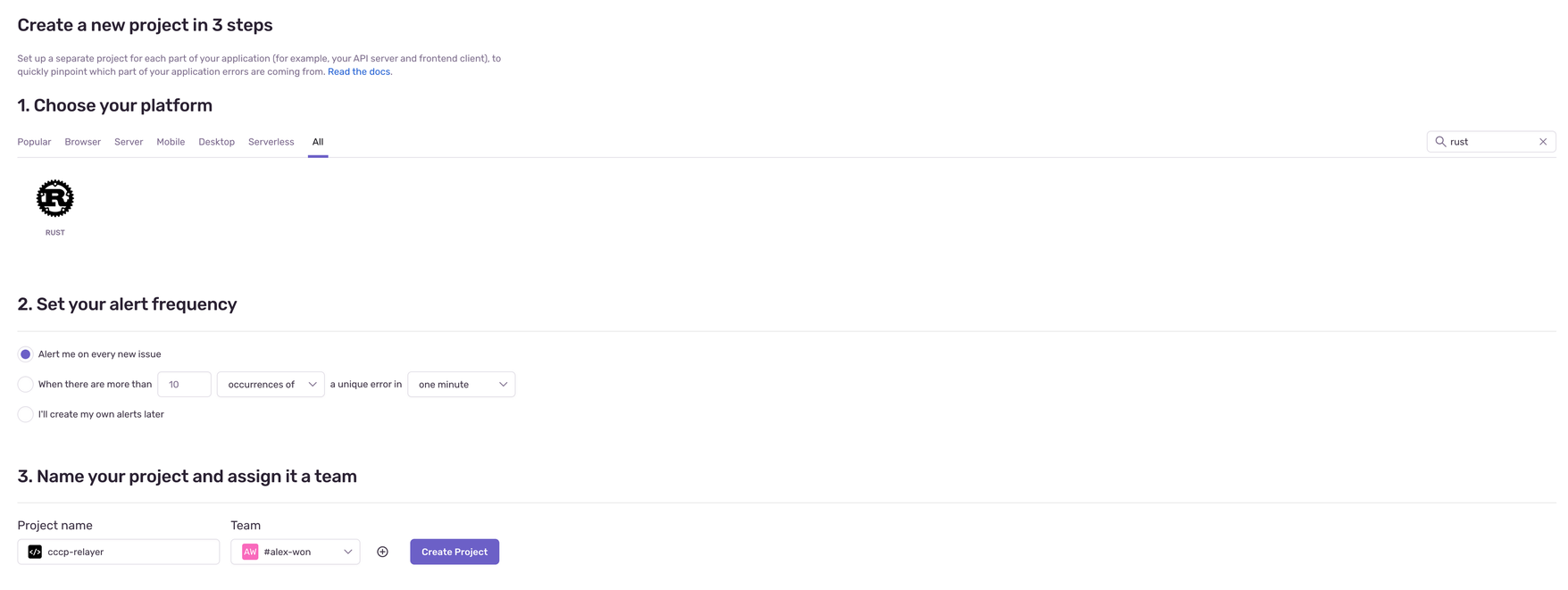 Sentry를 설정하려면 먼저 계정을 생성하고 https://sentry.io에 로그인해야 합니다. 그러면 Sentry 대시보드로 리디렉션됩니다. 이제 바이프로스트 릴레이어를 위한 새 프로젝트를 생성해야 합니다. "프로젝트 (Projects)" 탭에 접속한 다음 아래와 같이 새 프로젝트를 생성합니다. 플랫폼은 "RUST"로 설정해야 합니다. 그러나 알림 빈도와 프로젝트 이름은 자유롭게 사용자 정의할 수 있습니다.