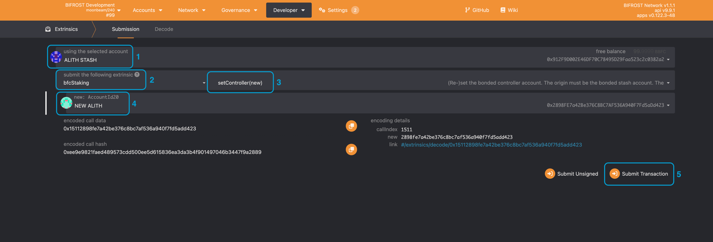 "bfcStaking" 팔렛 (pallet)을 선택합니다.