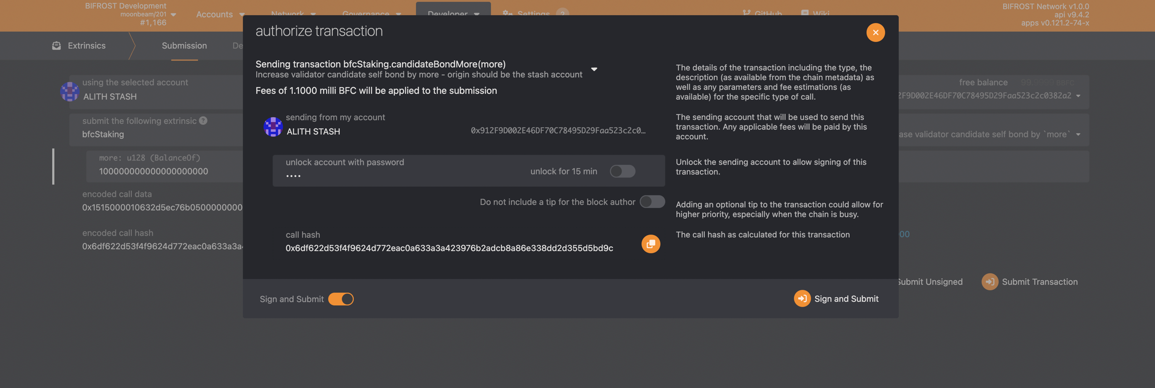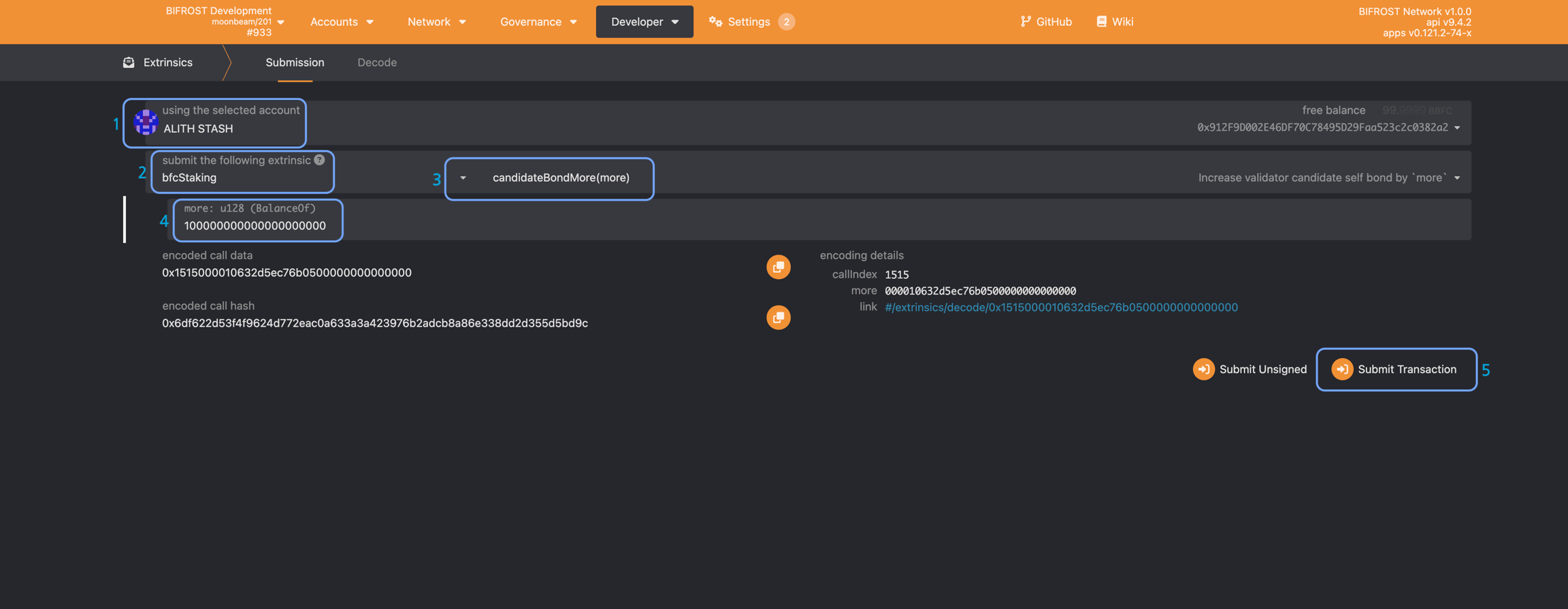 "candidateBondMore" 익스트린식 (extrinsic)을 선택합니다.