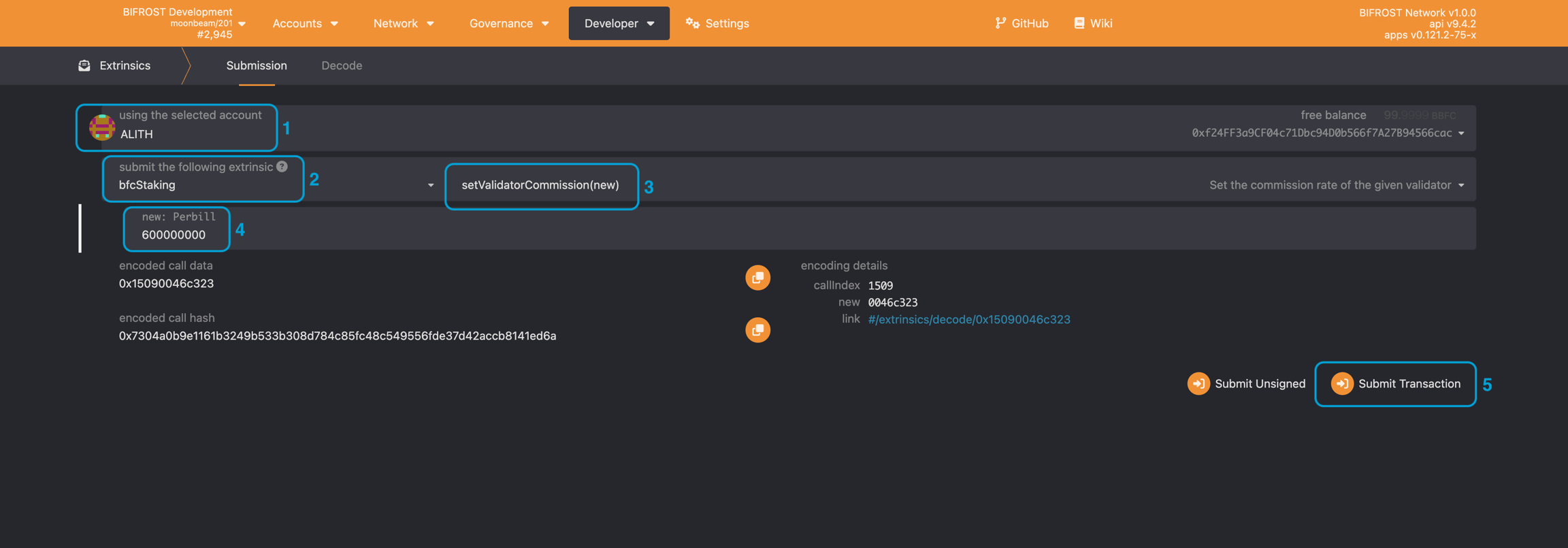 "setValidatorCommission" 익스트린식을 선택합니다.