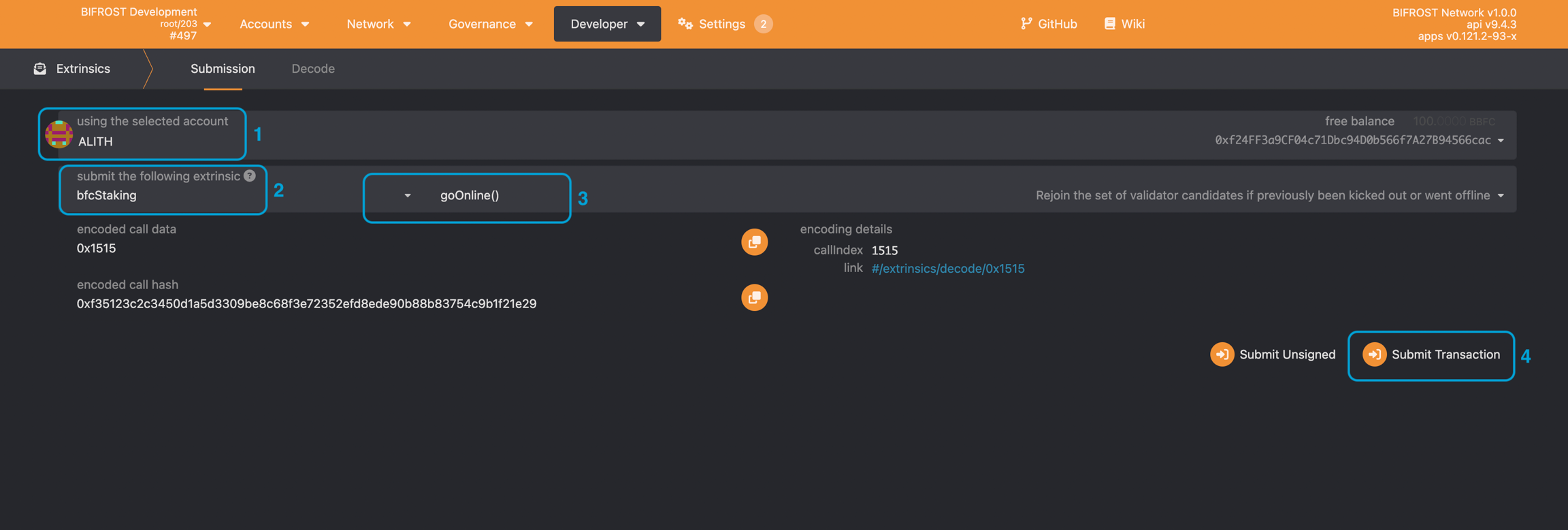 운영 중인 노드가 오프라인 상태로 전환되었거나, 오프라인 요청 없이 지속적인 비활성 상태로 인해 라운드에서 제외되었다면, 정상적인 검증자 활동을 진행하기 위해 노드를 온라인 상태로 다시 전환해야 합니다. 그렇지 않으면 해당 검증자는 활성 검증자로 선택되지 않습니다.