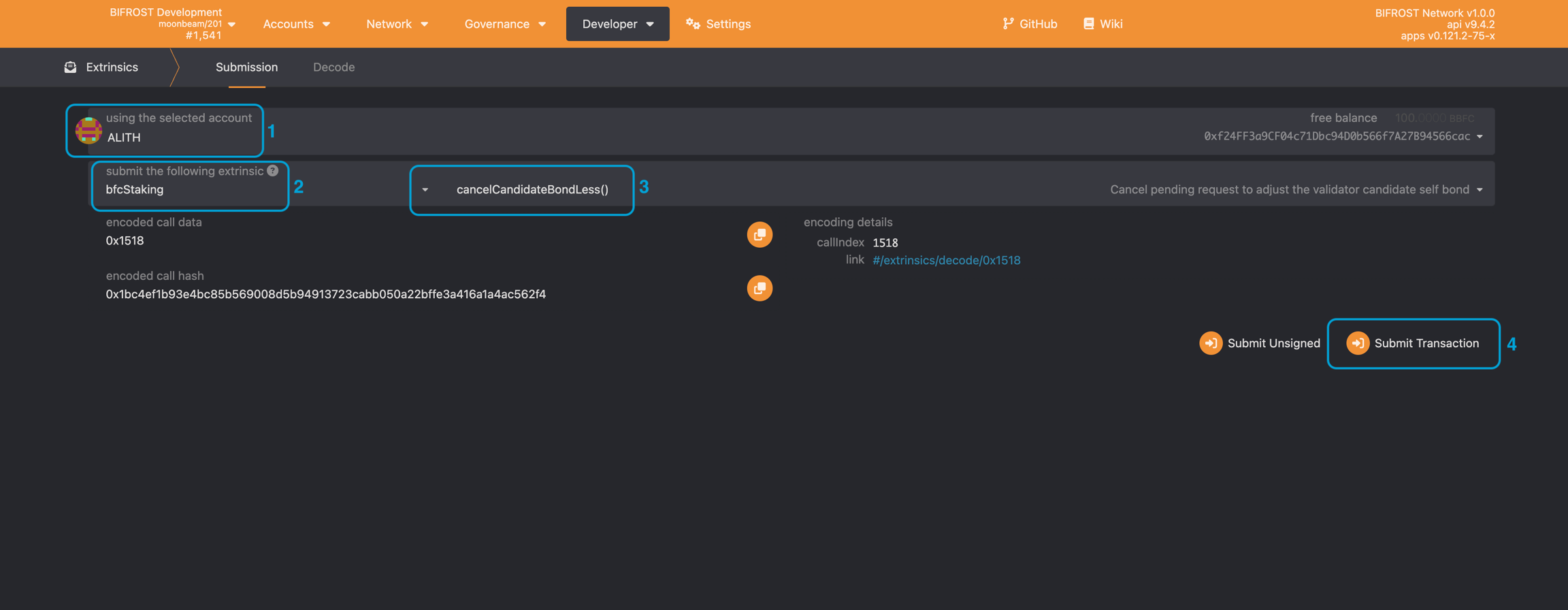 "cancelCandidateBondLess" 익스트린식을 선택합니다.