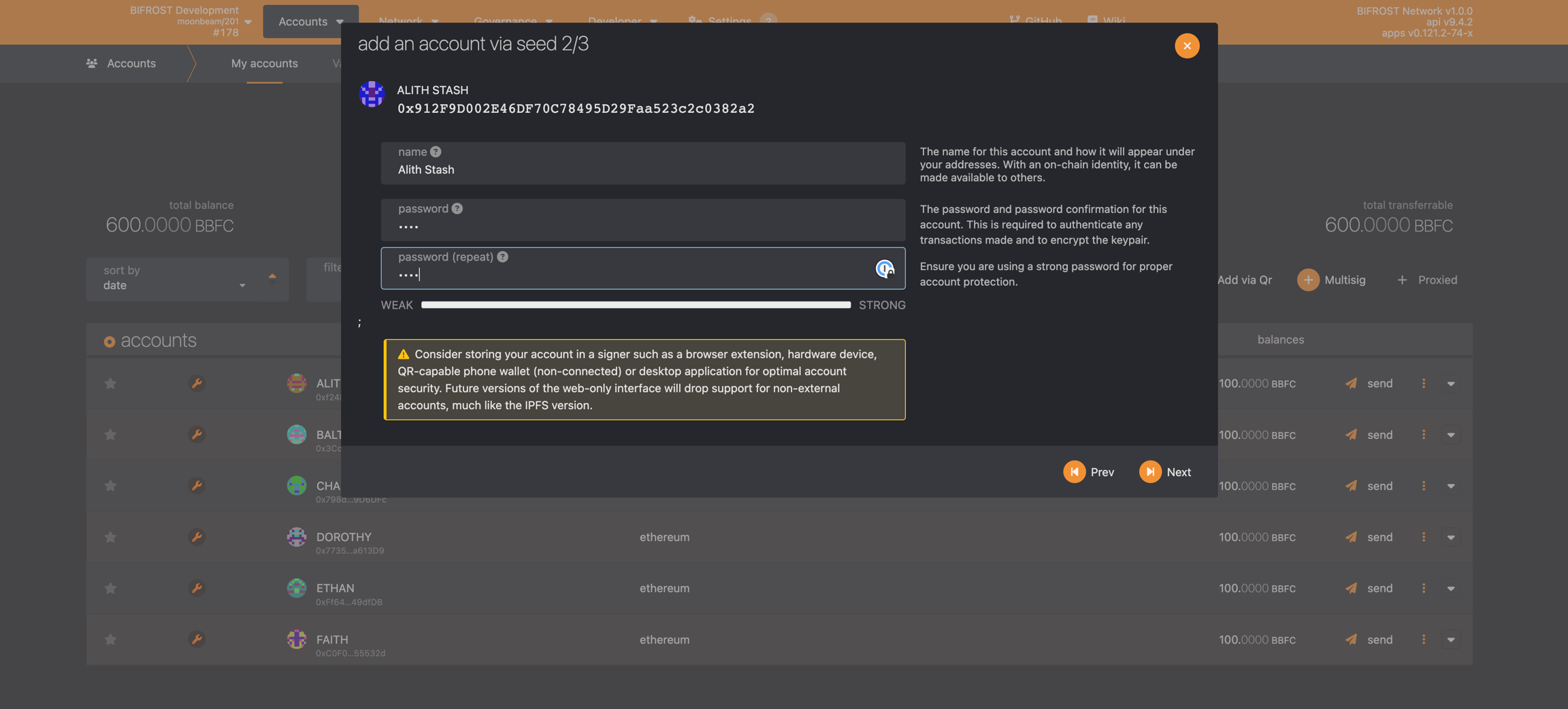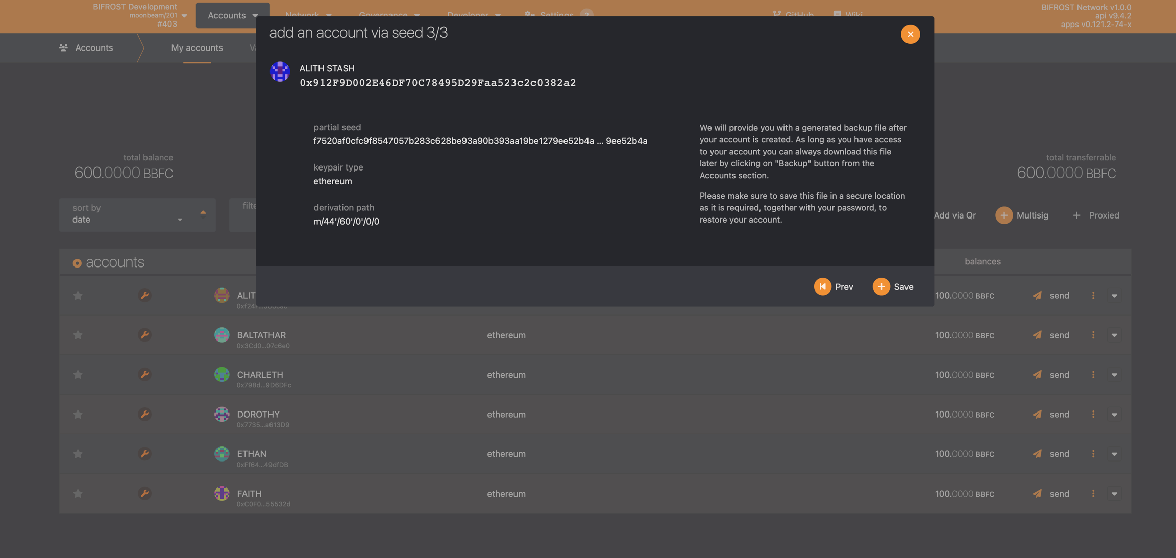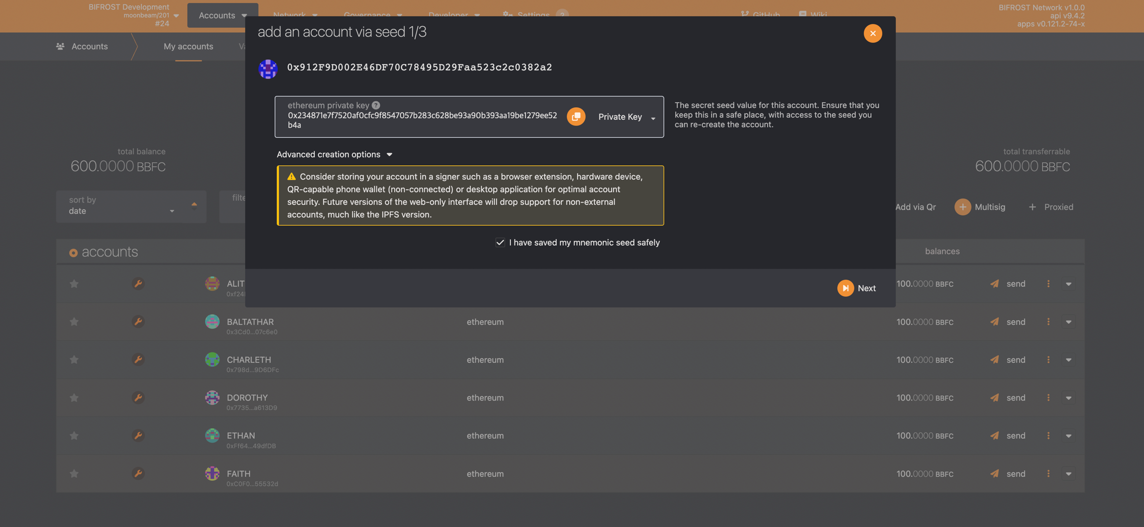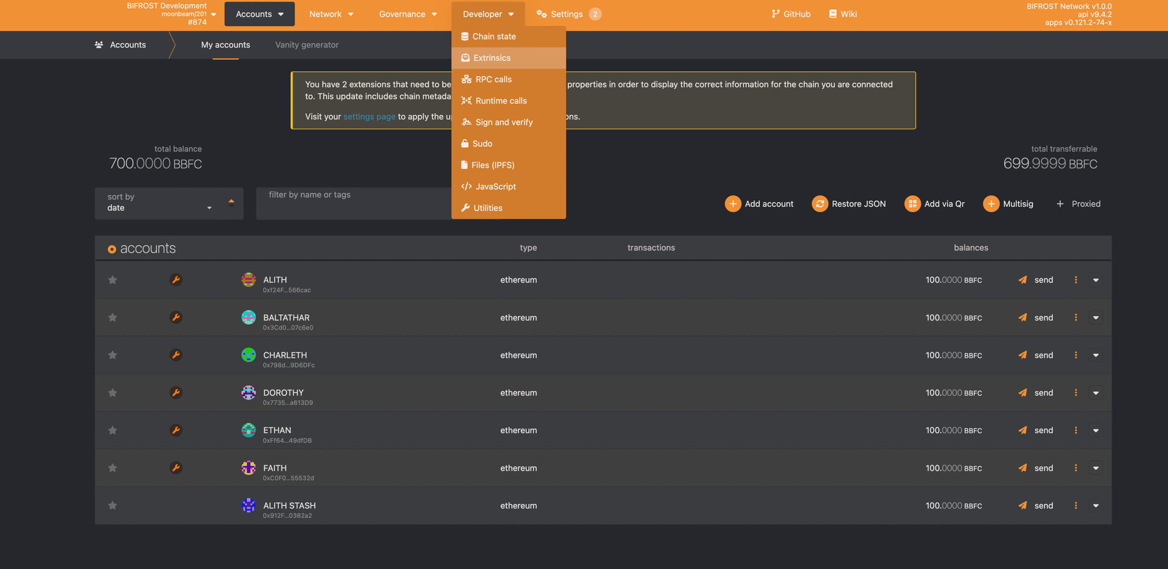 추가 예치를 진행하려면 스태시 계정이 polkadot.js 앱 페이지에 미리 등록되어 있어야 하며, 해당 계정은 추가로 예치하려는 BFC를 충분히 보유하고 있어야 합니다.