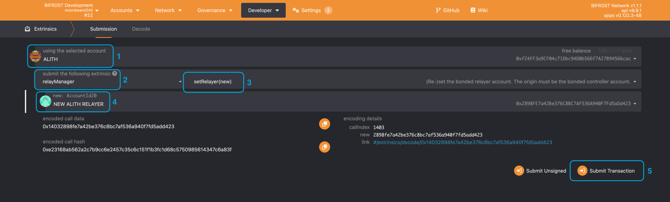 "setRelayer()" 익스트린식 (extrinsic)을 선택합니다.