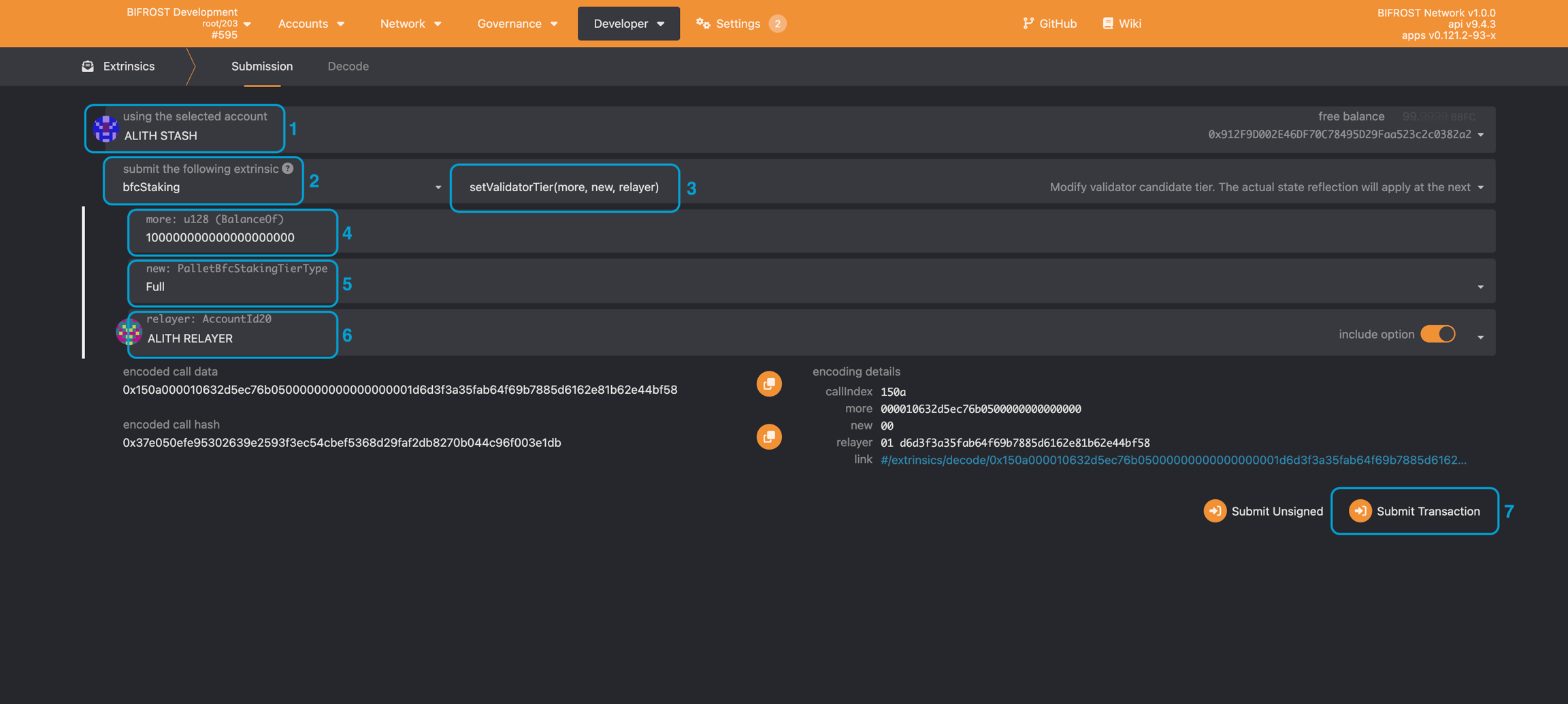more매개변수에 BFC 금액을 wei 단위로 입력합니다. 그렇지 않으면 0을 입력합니다.변경하고자 하는 노드의 티어를 선택합니다. ("Full" 또는 "Basic" 선택)