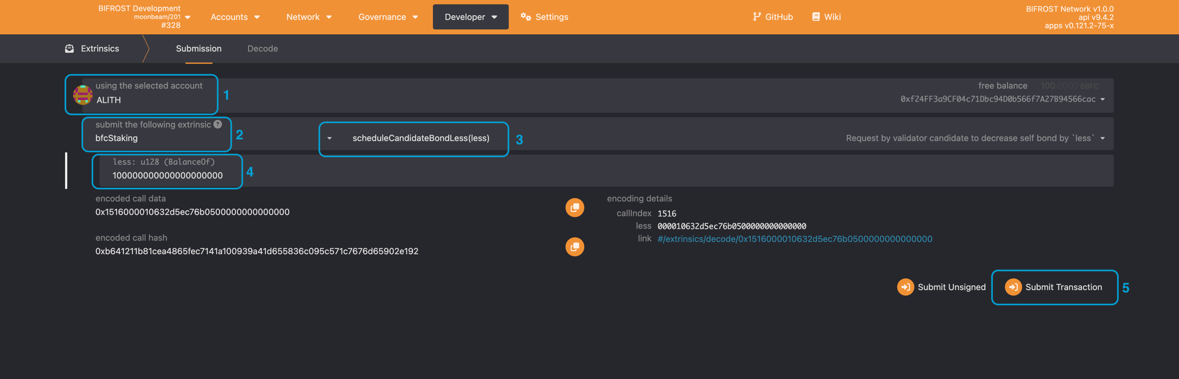 "scheduleCandidateBondLess" 익스트린식 (extrinsic)을 선택합니다.