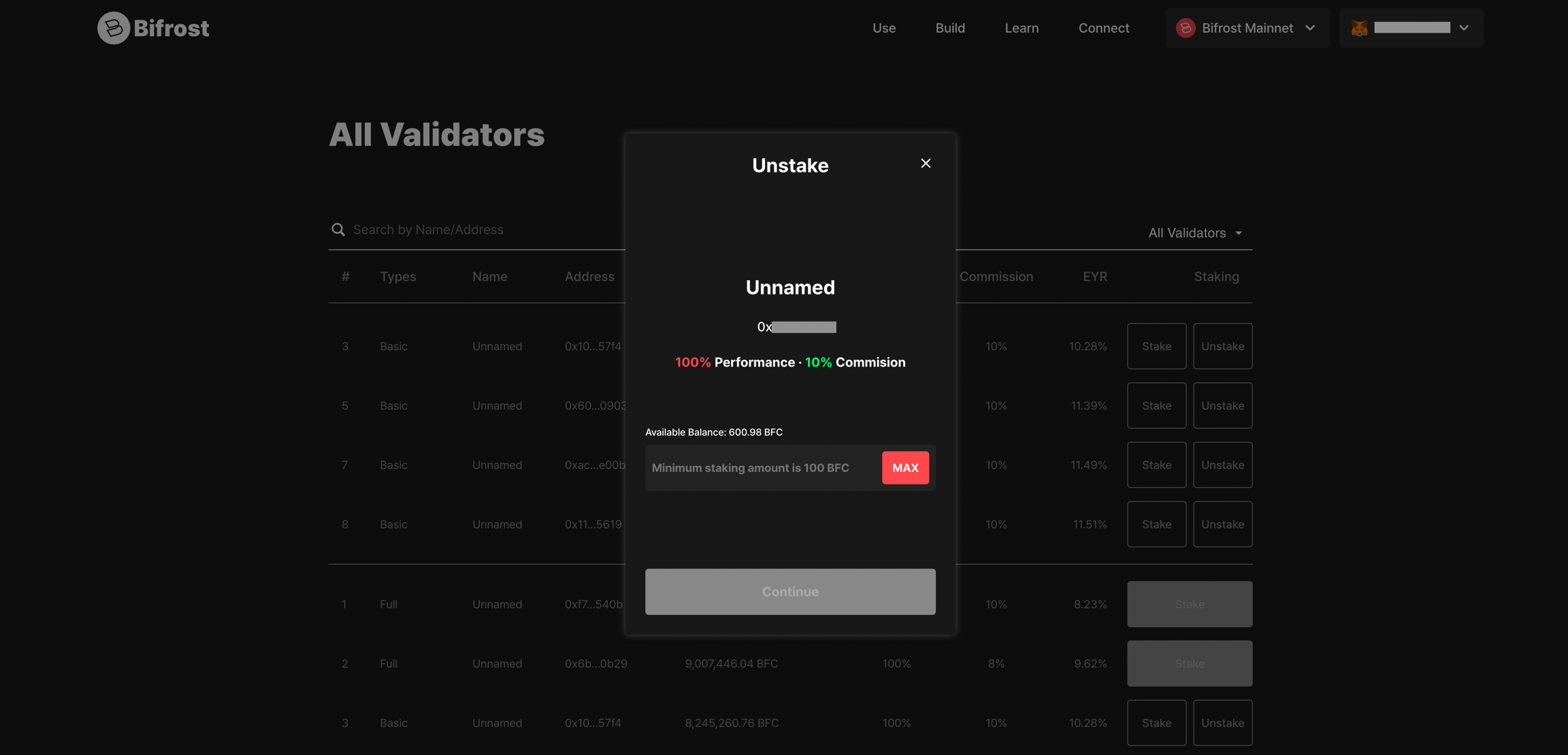 지갑을 연결한 후, "모든 밸리데이터 (All Validators)" 섹션에서 언스테이킹할 자산 선택후 , 수량을 입력한 뒤 “계속(Continue)” 버튼을 클릭합니다.